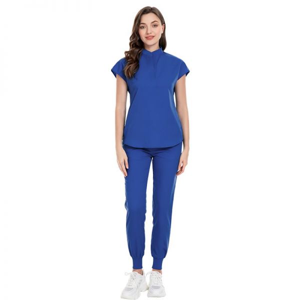 е елегантен и модерен дамски комплект в наситено кралско синьо, който съчетава стилна визия и практичен комфорт. Горната част с изправена яка и изчистен силует придава изискан и професионален вид, а панталонът с еластични маншети осигурява удобство и свобода на движение през целия ден. Леката и дишаща материя прави комплекта подходящ за интензивна работна среда. Перфектен избор за медицински, козметични и естетични специалисти, които търсят модерна и уверена визия.
