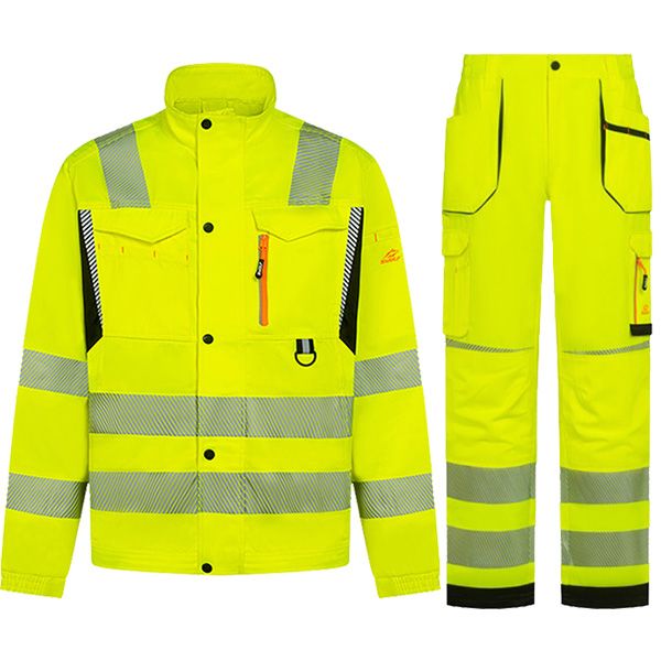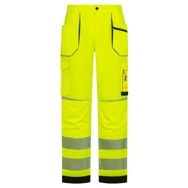 - Работен панталон с висока видимост, изработен от здрава комбинация от памук, полиестер и еластан, осигуряващ комфорт, издръжливост и свобода на движение.