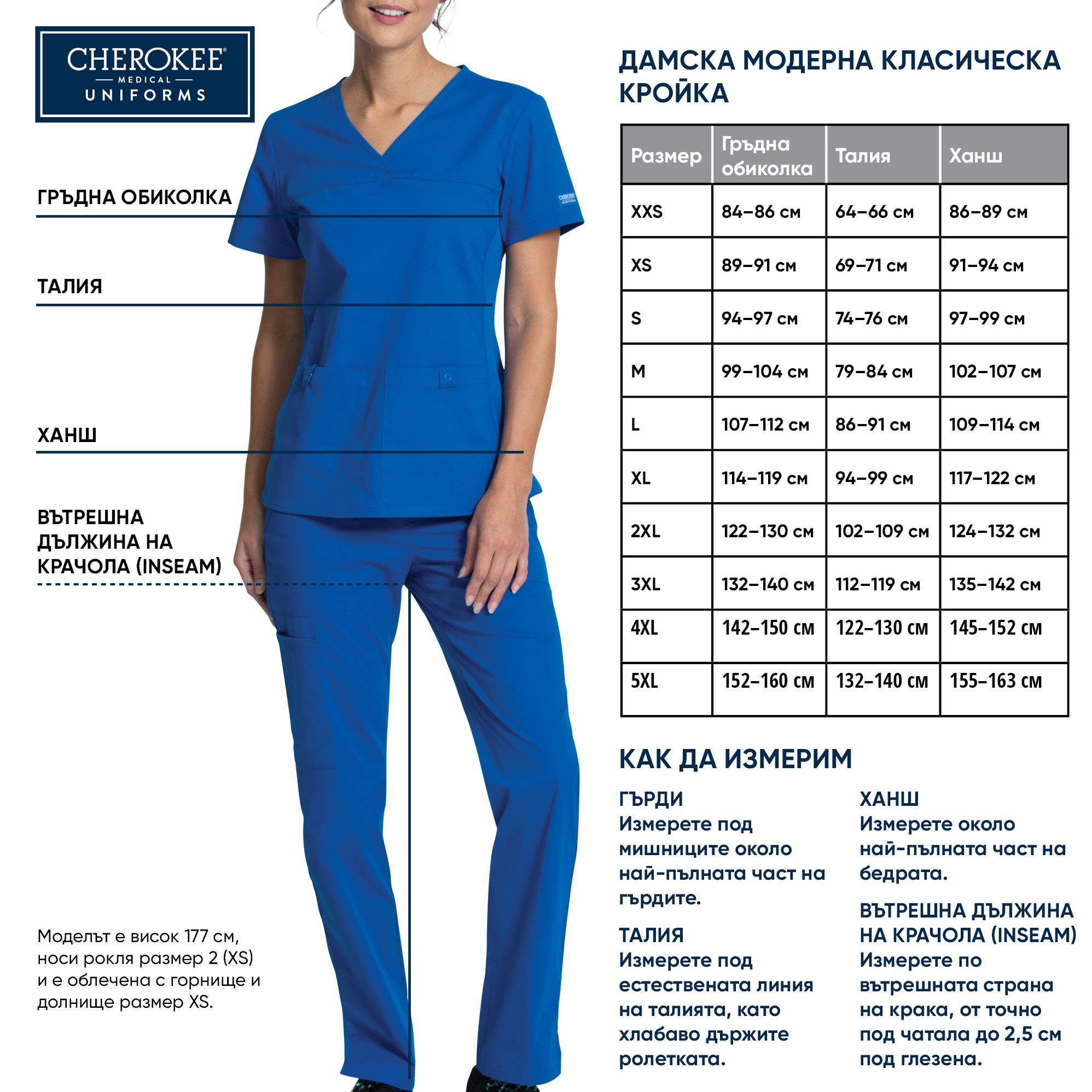 Важно! Размерите на медицинско облекло с марка Cherokee са уголемени. За да определите вашия размер, използвайте посочената таблица в описанието: